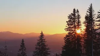 日出时从高处被雾气覆盖的森林