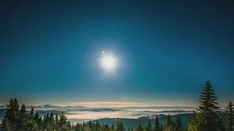 在繁星点点的天空在冬季森林明亮的月亮