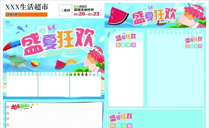 超市盛夏狂欢, 超市夏日促销, 夏日DM单模板, 促销模板, 蓝色模板, 设计, 广告设计, 广告设计, CDR, 收起